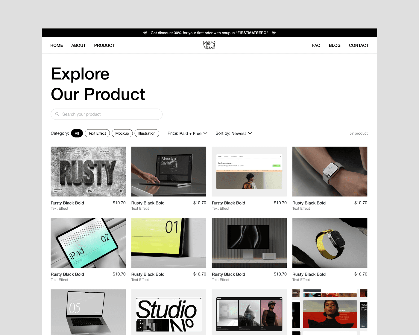 My second template, an e-commerce design, is currently in development. It includes pages like Homepage, Product Detail, All Products (with search functionality), Blog Detail, and All Blog.